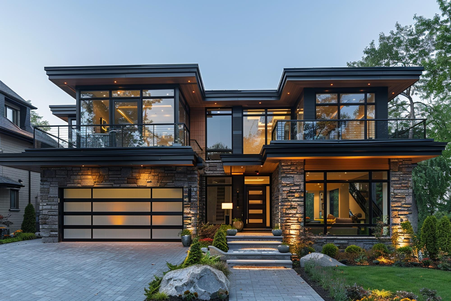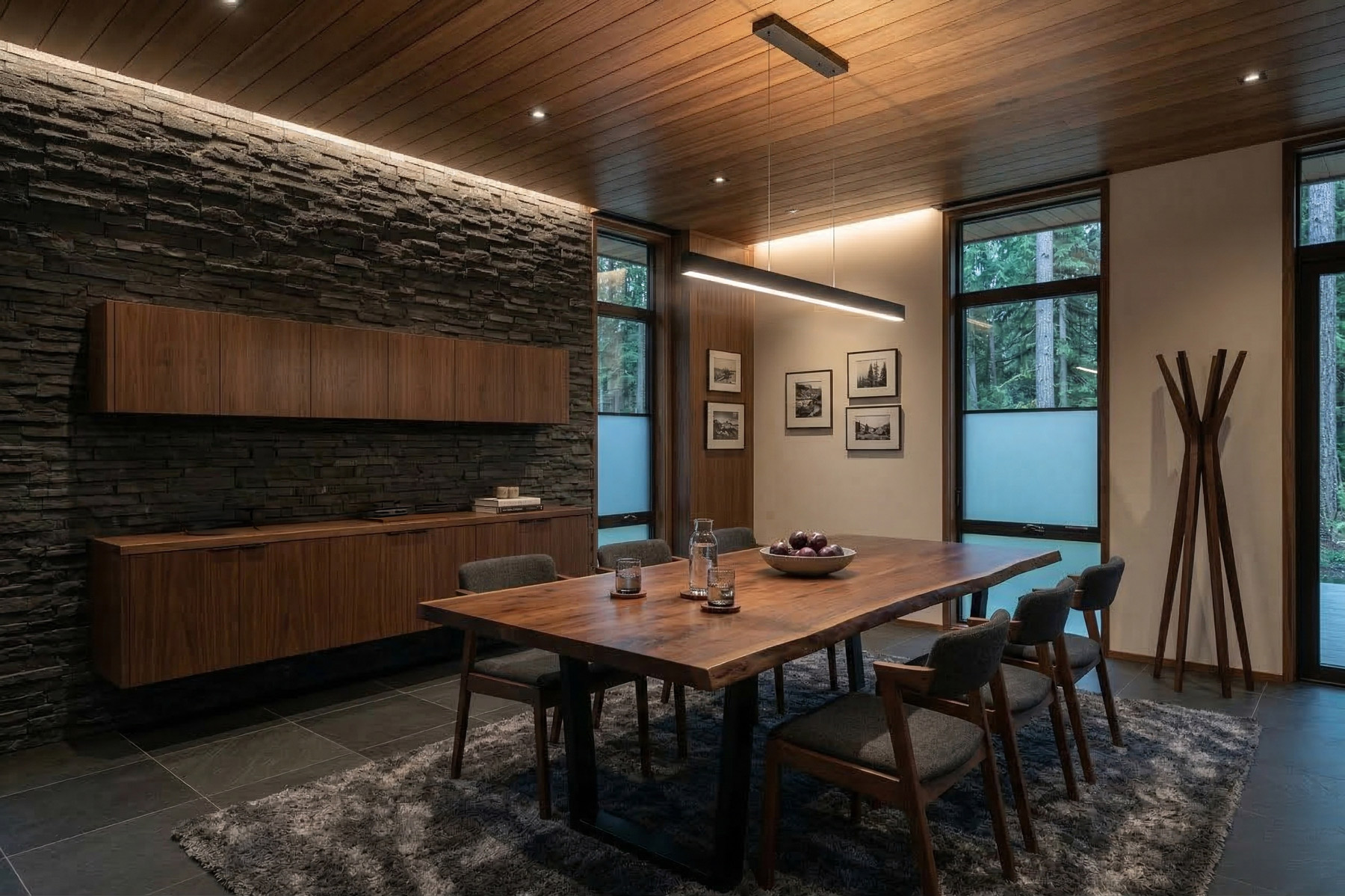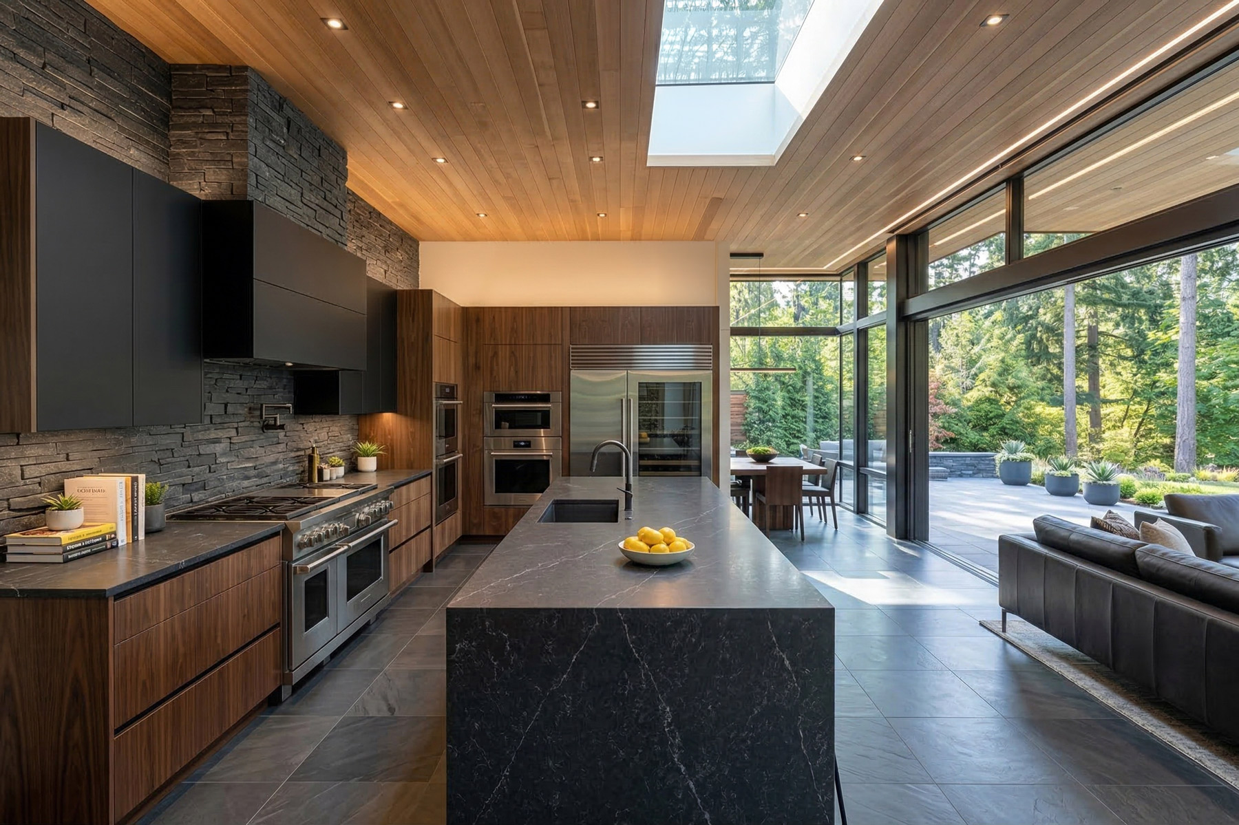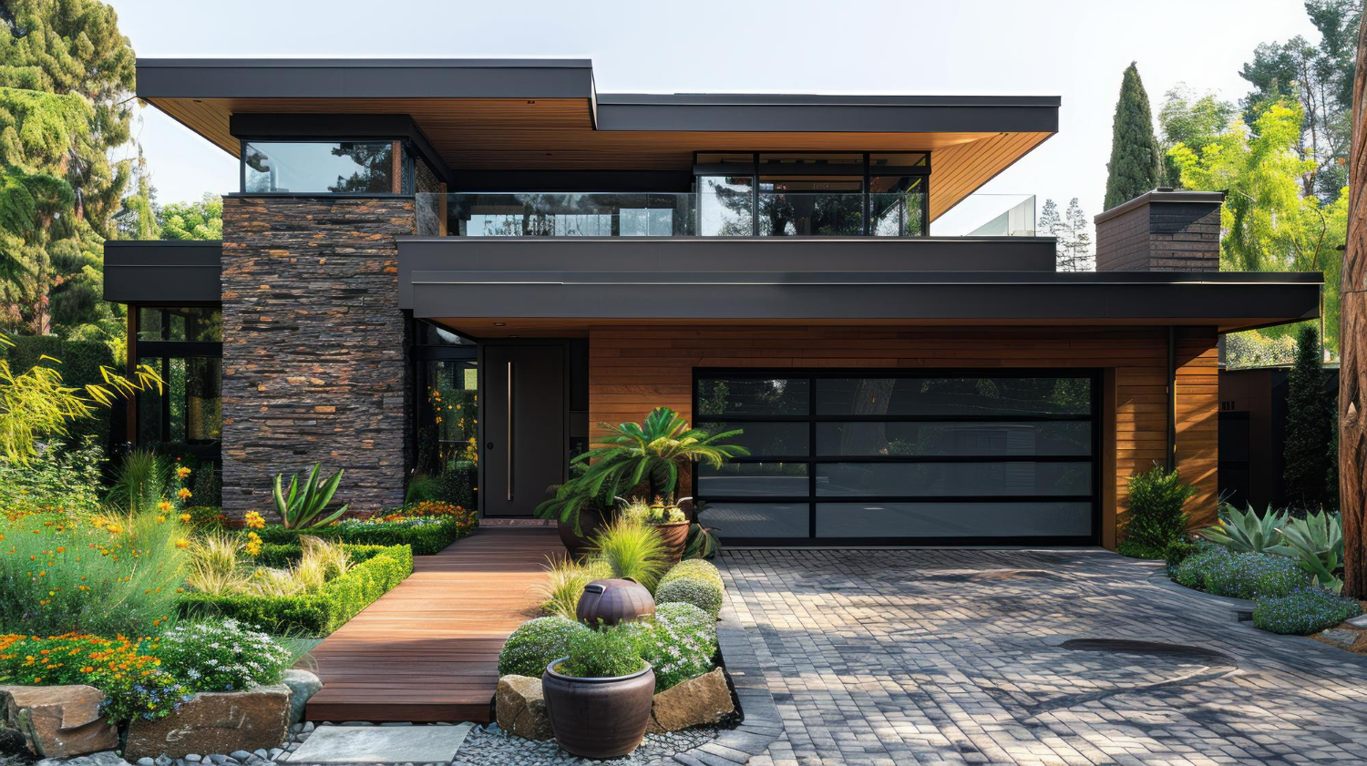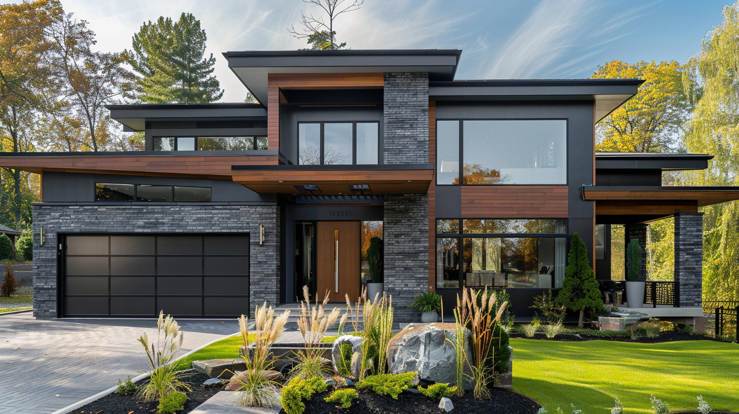 Dark wood, black metal window framing, and flat or cantilevered rooflines keep the overall direction firmly modern. Inside, wood ceiling planks and walnut cabinetry warm the palette without softening the edge. This is a direction for clients who want weight, presence, and a home that looks like it was built to last a long time.